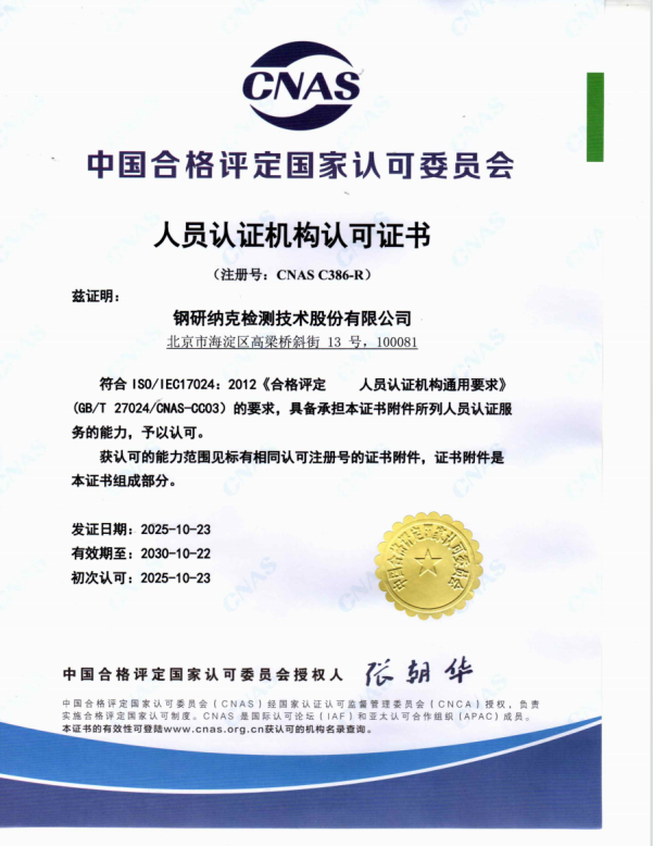 钢研纳克检测技术股份有限公司人员认证中心(冶金无损检测人员技术资格鉴定委员会)是中国合格评定国家认可委员会(英文简称CNAS)认可的无损检测人员认证机构,依据 ISO/IEC 17024:2012《合格评定 人员认证机构通用要求》(GB/T 27024/CNAS-CC03)标准获得认可(认可注册号:CNAS C386-R),证书见附件A,颁发带有CNAS认可标识的无损检测证书。北京培训中心兹定于2026年3月12日~4月16日在北京市举办ISO 9712 超声、磁粉的1级、2级培训班。有关本次培训活动的相关事项及要求通知如下: