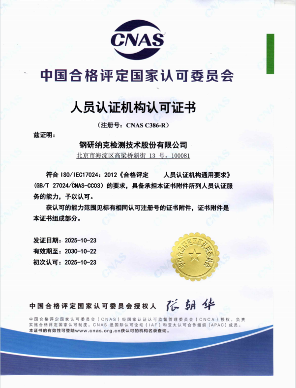 钢研纳克检测技术股份有限公司人员认证中心(冶金无损检测人员技术资格鉴定委员会)是中国合格评定国家认可委员会(英文简称CNAS)认可的无损检测人员认证机构,依据 ISO/IEC 17024:2012《合格评定 人员认证机构通用要求》(GB/T27024/CNAS-CC03)标准获得认可(认可注册号:CNAS C386-R),证书见附件,颁发带有CNAS认可标识的无损检测证书。兹定于2026年6月5日~7月8日在北京举办ISO 9712 超声(UT)、磁粉(MT)、漏磁(MT-FL)、渗透(PT)、涡流(ET)、射线(RT)、目视(VT)3级人员初次认证培训班。有关本次培训活动的相关事项及要求通知如下: