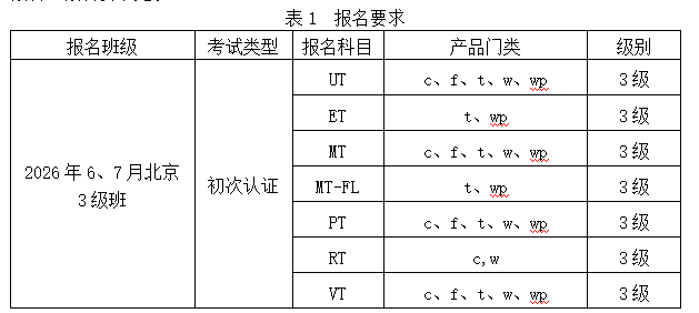 申请人应于2026年6月4日前登录人员认证中心网站www.yjndt.org.cn进行在线报名,报名要求见表1。